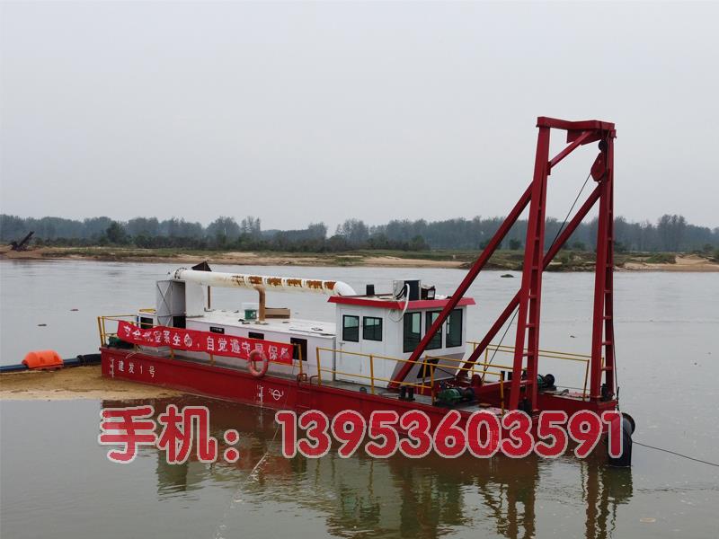 主柴油机通过齿轮箱带动抽沙泵高速旋转,使抽沙泵产生真空;另一台柴油机带动高压射水泵,高压泵射出高压水,将水下的矿层打散然后用抽沙泵将泥浆从吸泥管吸入,经过排泥管输送到岸边。